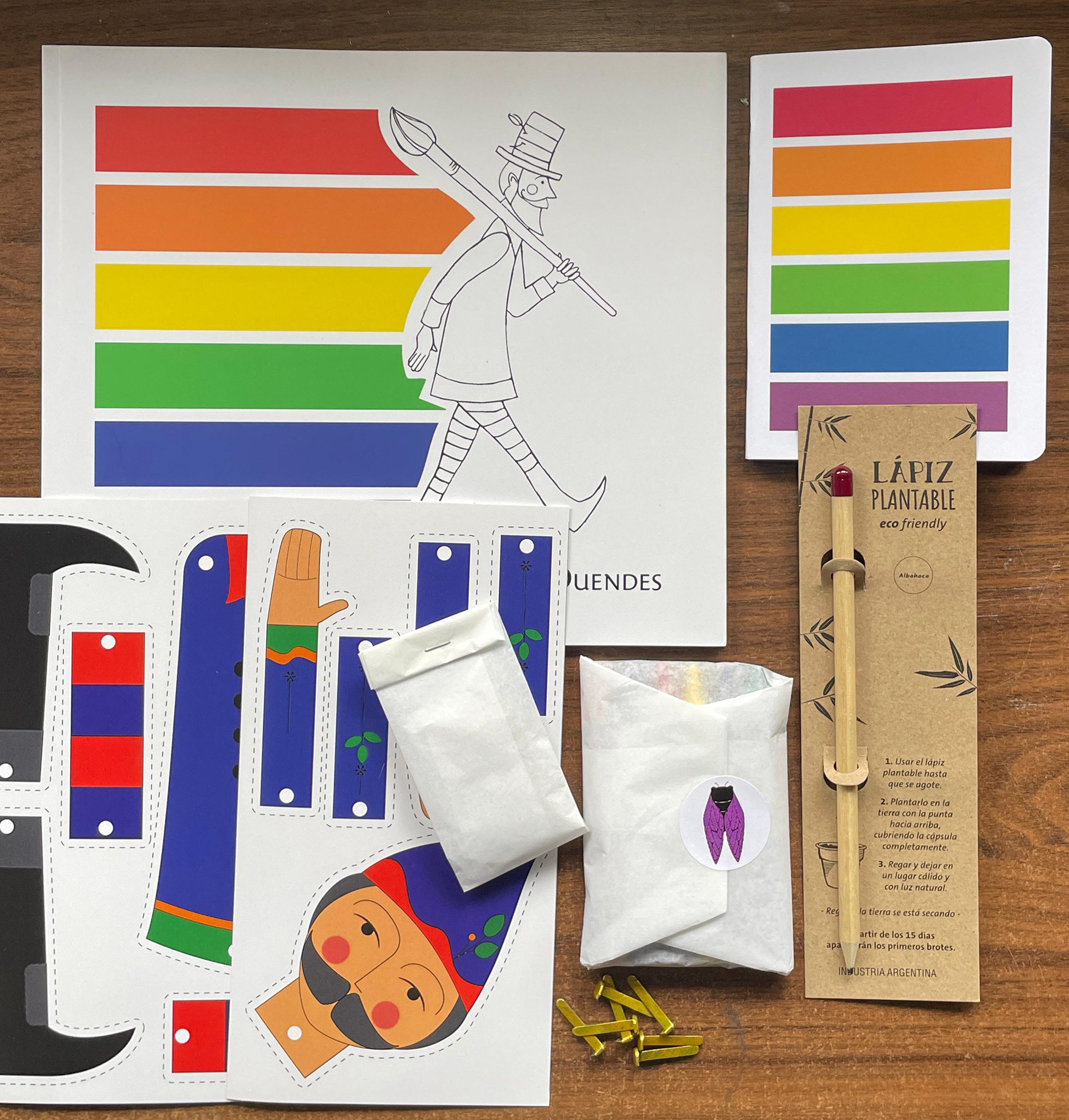 El kit completo tiene, junto al libro, una libreta A6, un lápiz plantable, un juego de crayones y una marioneta para cortar y armar.