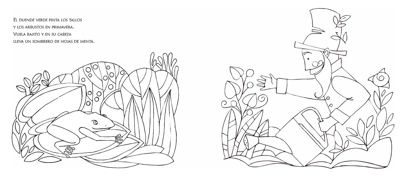 Un libro para leer y pintar, poemas en imprenta mayúscula. Con espacio para imaginar formas y colores, para crear. Poemas de Angélica Quatrin - Ilustraciones de Alejandra Karageorgiu. Formato 24 x 21 cm., 36 páginas, blanco y negro, tapa color.