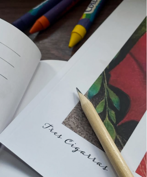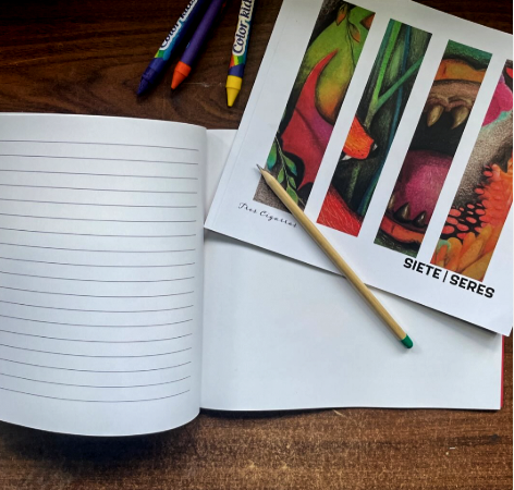 El kit completo tiene, junto al libro, una libreta A5, un lápiz plantable y un juego de crayones.